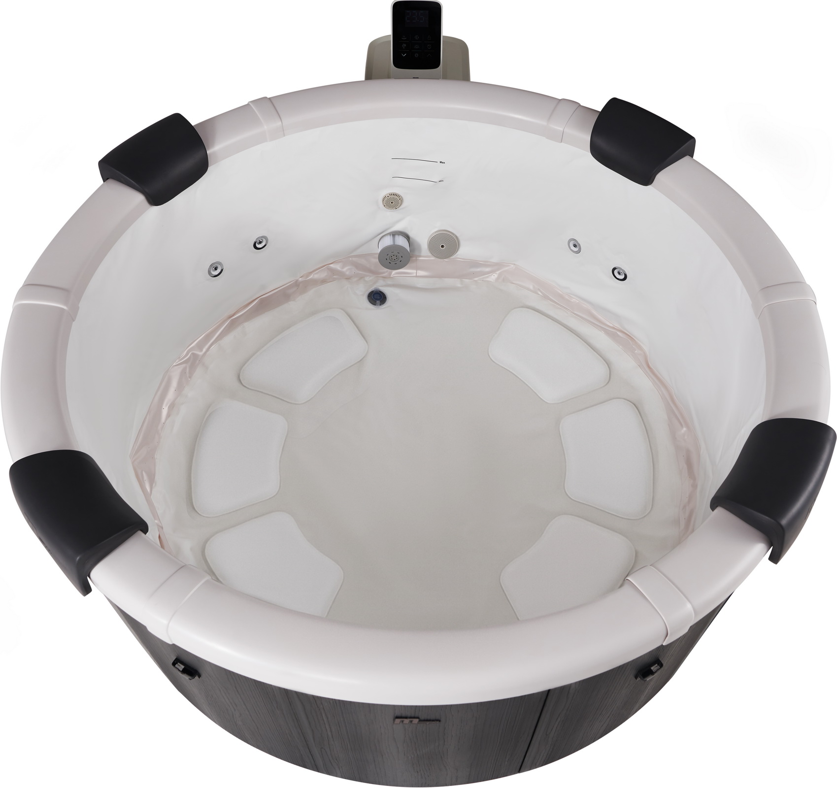 Запатентованная система аэромассажа с размещением форсунок по периметру бассейна в шахматном порядке, наполняет равномерно спа тысячами воздушных пузырьков толкая их к центру чаши, создавая сбалансированный, всеобъемлющий массаж тела.