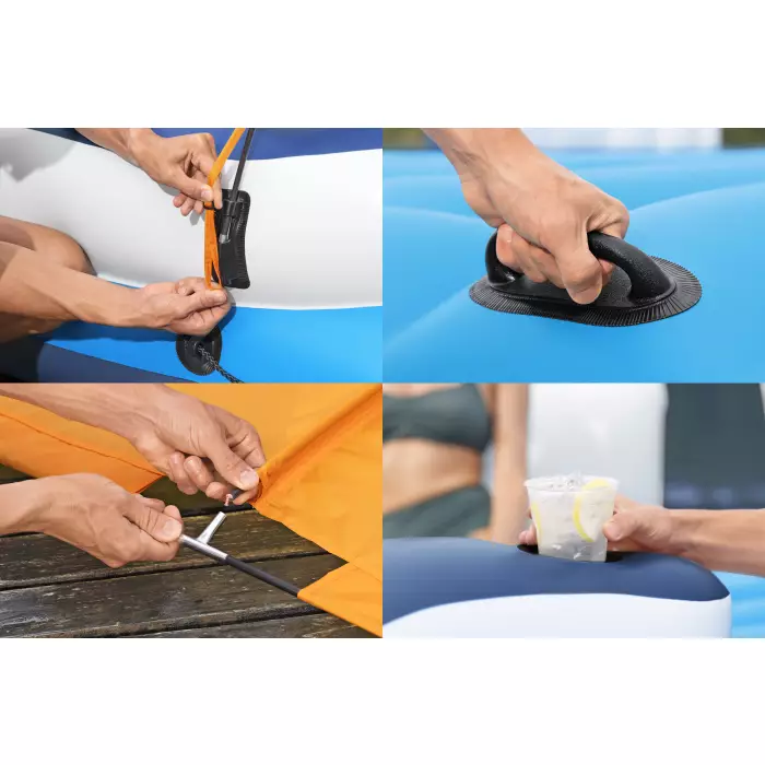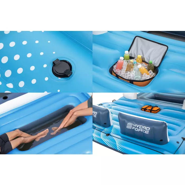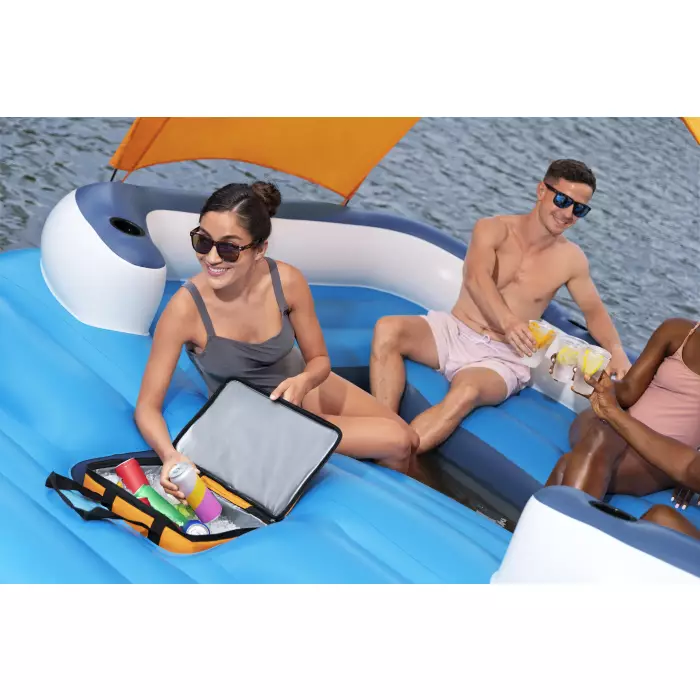 В комплект входят: Один островок, один солнцезащитный тент, одна сумка-охладитель, ремонтная заплата
