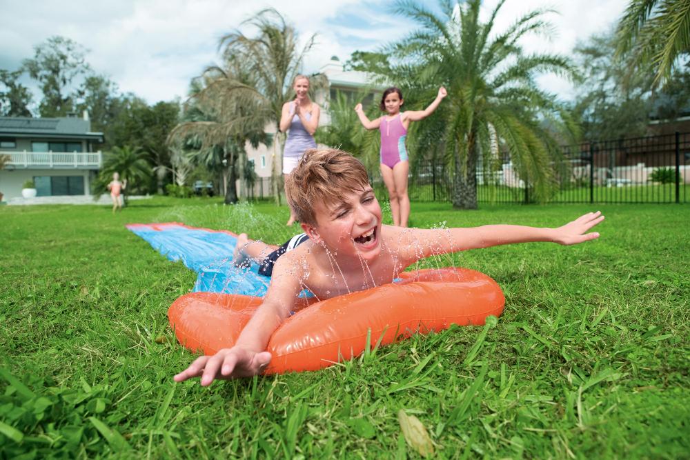 - Для скольжения подключите садовый шланг к специальному отверстию в изделии;
