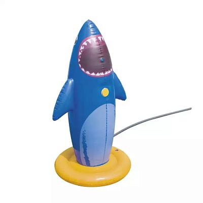 После заполнения водяной камеры, для дополнительной стабильности, просто подключите акулу к садовому шлангу, нажмите кнопку на акуле и наслаждайтесь брызгами воды!